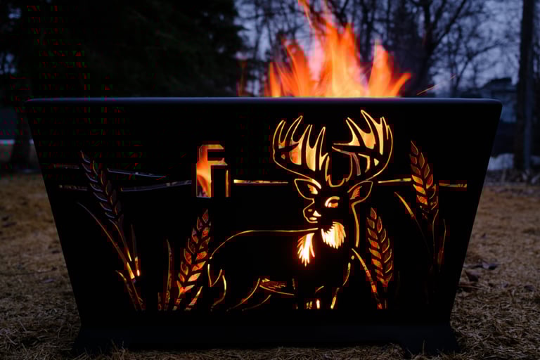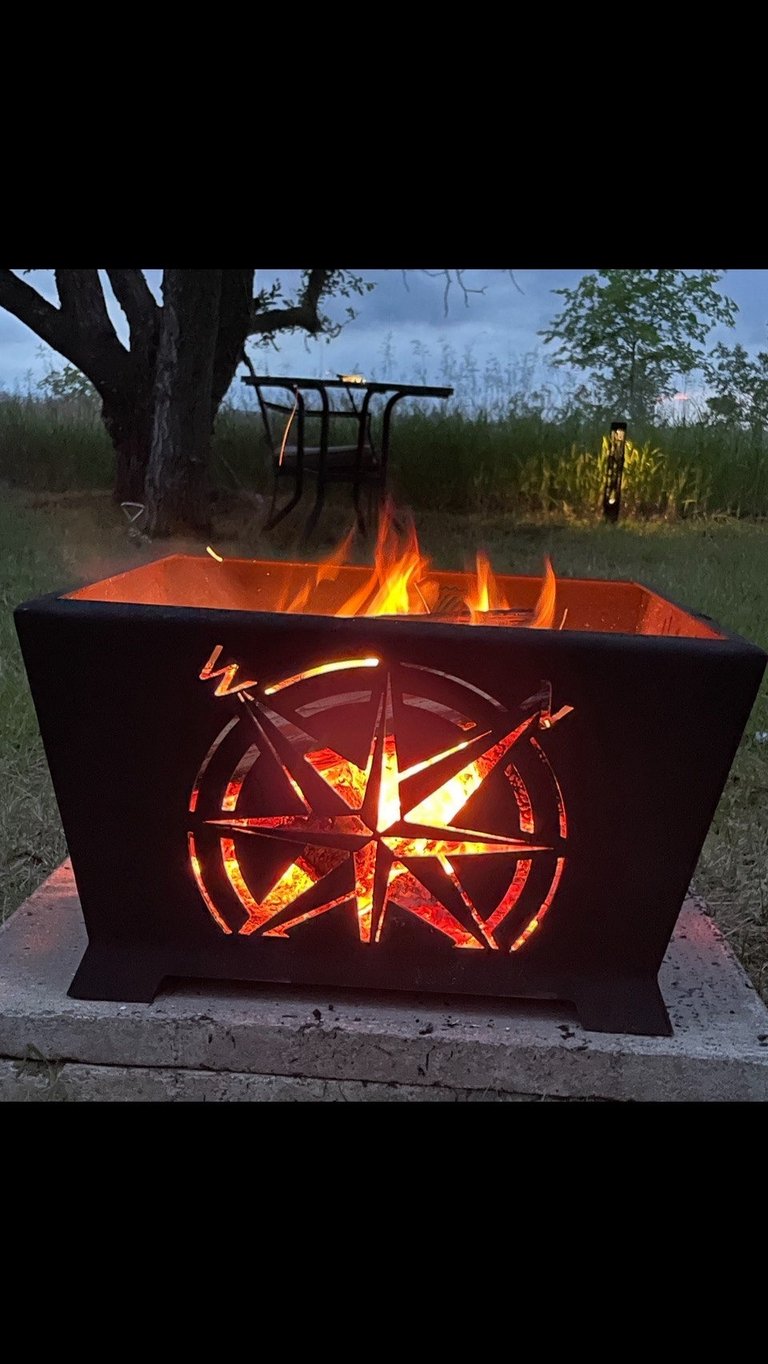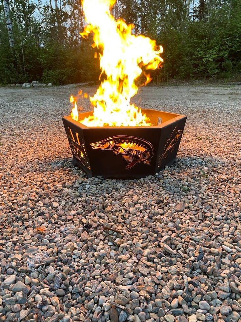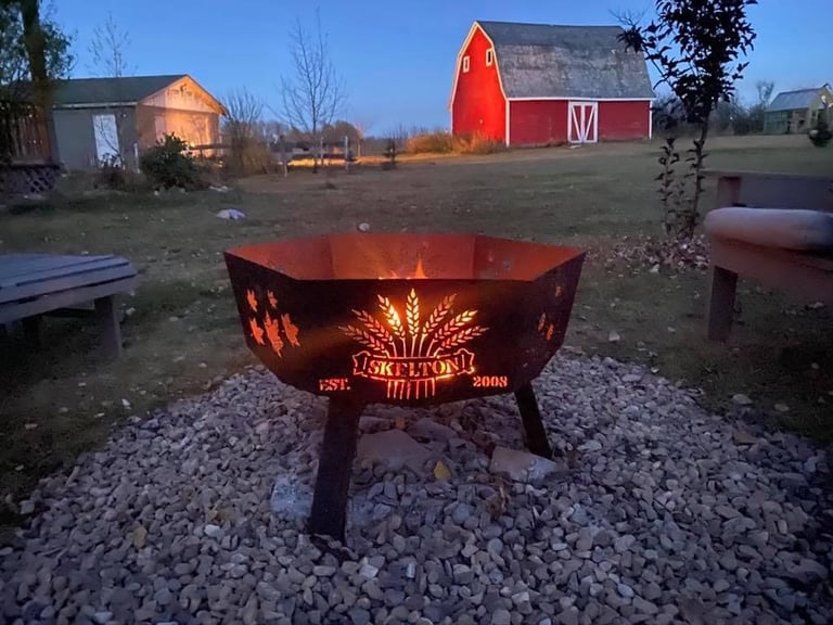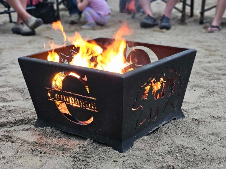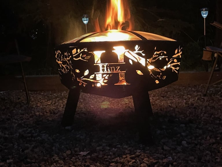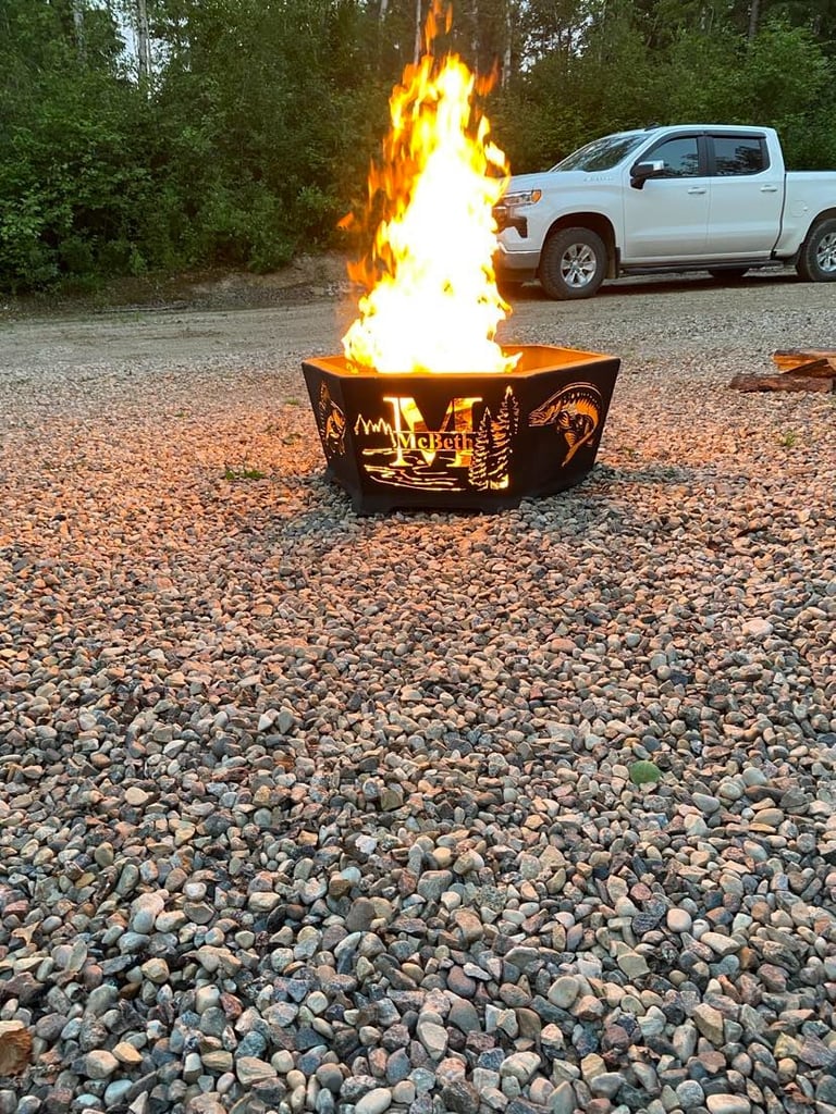 All of our firepits are made from durable 10 gauge steel. They are manufactured with reinforcing bends and skillfully welded. Each model is thoughtfully designed to have a bottom with drainage holes and legs to elevate them off the ground. This ensures your pit will last for years to come. Each pit allows you to choose meaningful designs and work with us to bring them to life.