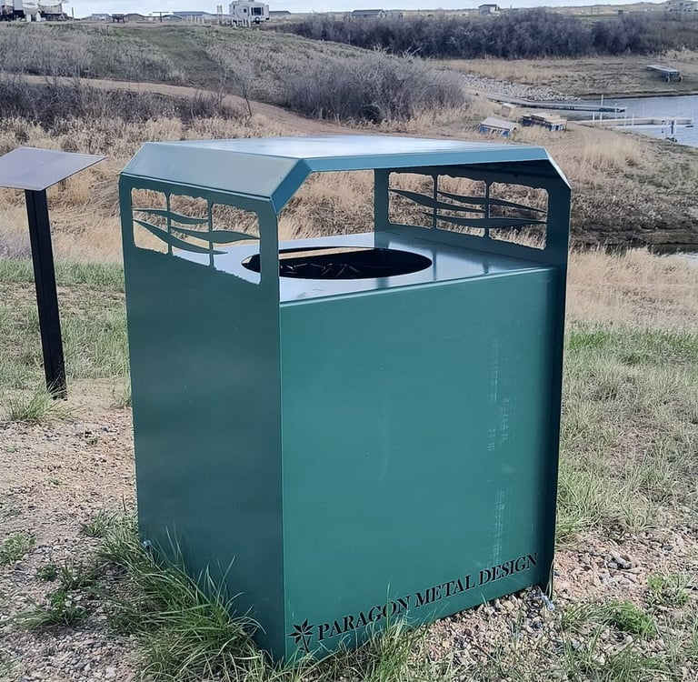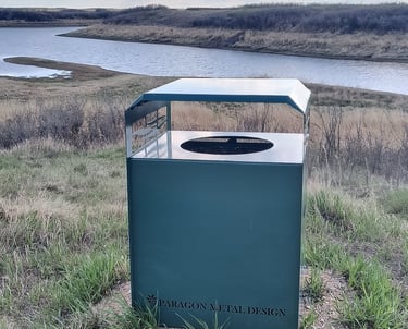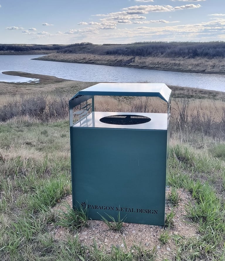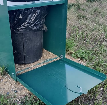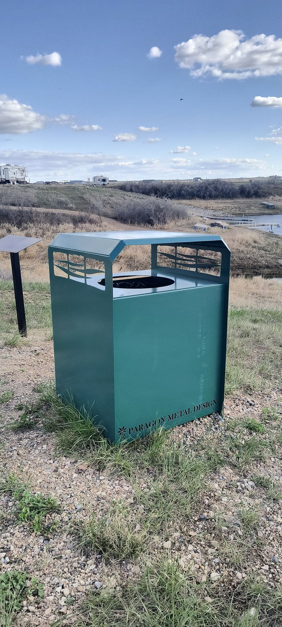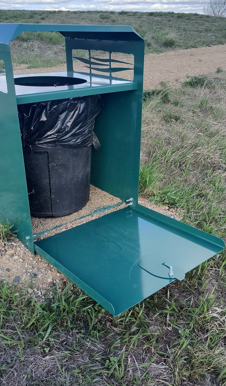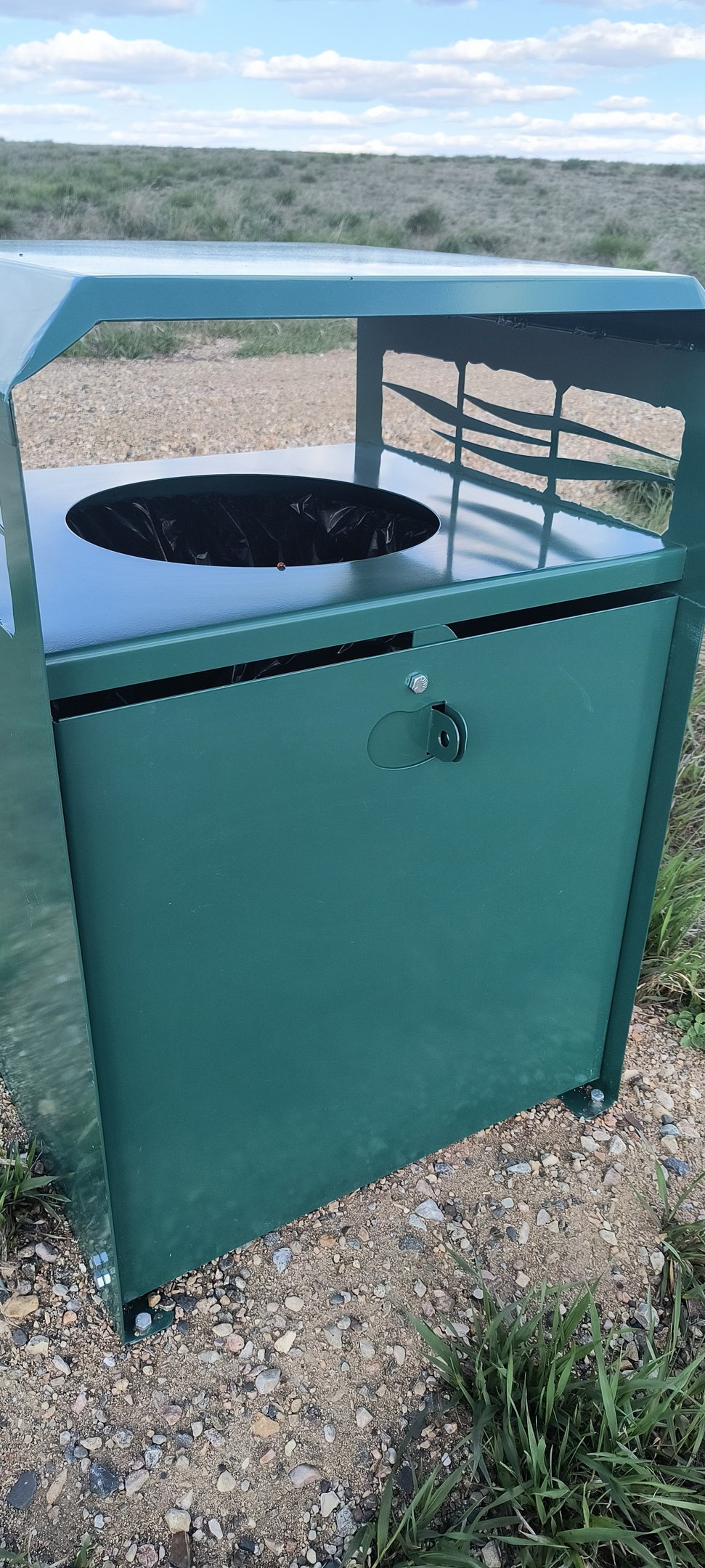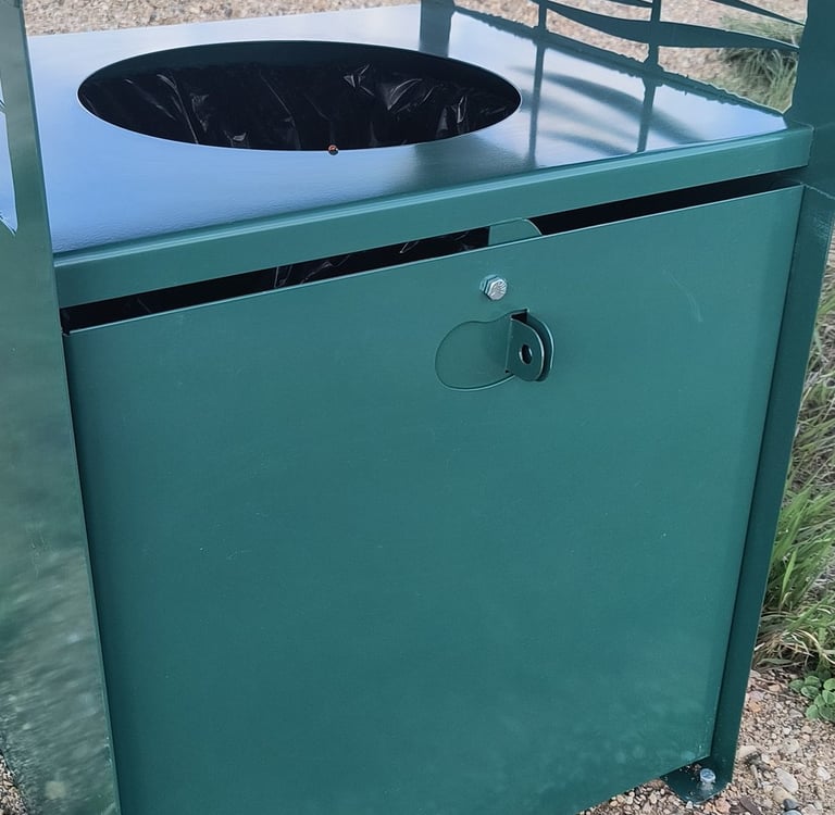 These waste bins are easy to empty and securely latch. They keep the rain out of the trash. They provide space to include a logo, advertisement or a friendly reminder to keep our spaces clean.